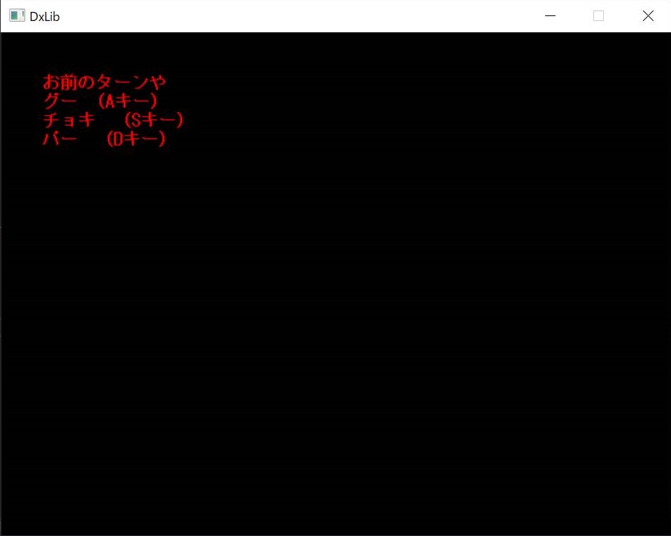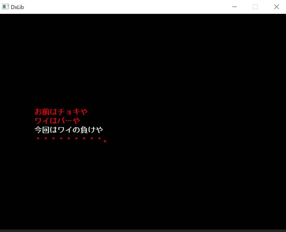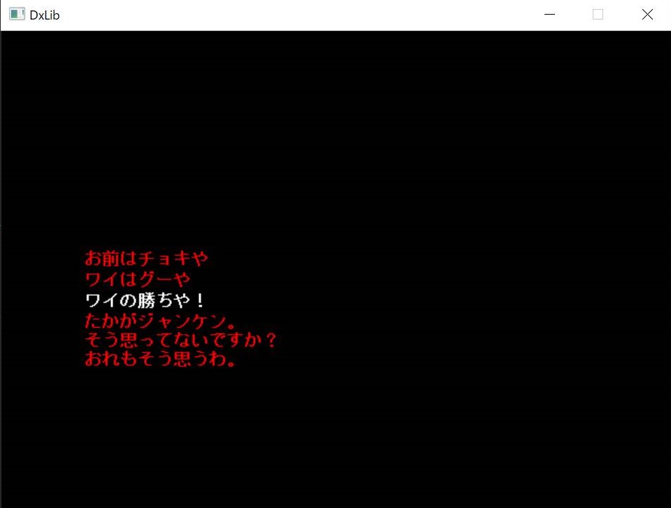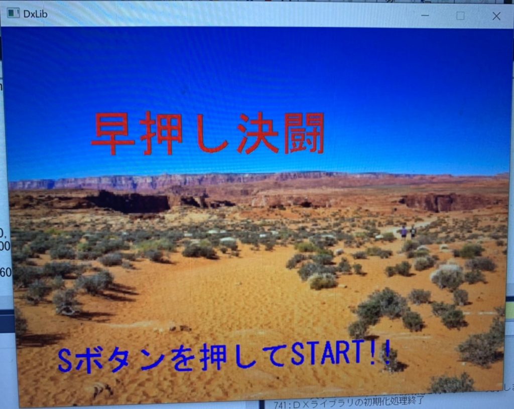 4年次ですが、「慣れていないDXライブラリで何か作ってみたい」ということでこちらの枠で紹介します。「決闘」を使ったゲームで、簡単に言うと「本田のじゃんけん」ですね。ただ元ネタの関係で、勝率3分の1の普通のじゃんけんでは無く、相手の勝率が7割程になっているそうです。勝敗を決め、それから相手の手を決定するようにしているということで、上手く再現できていたように感じました。